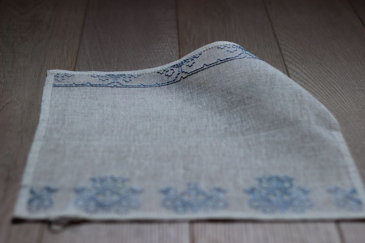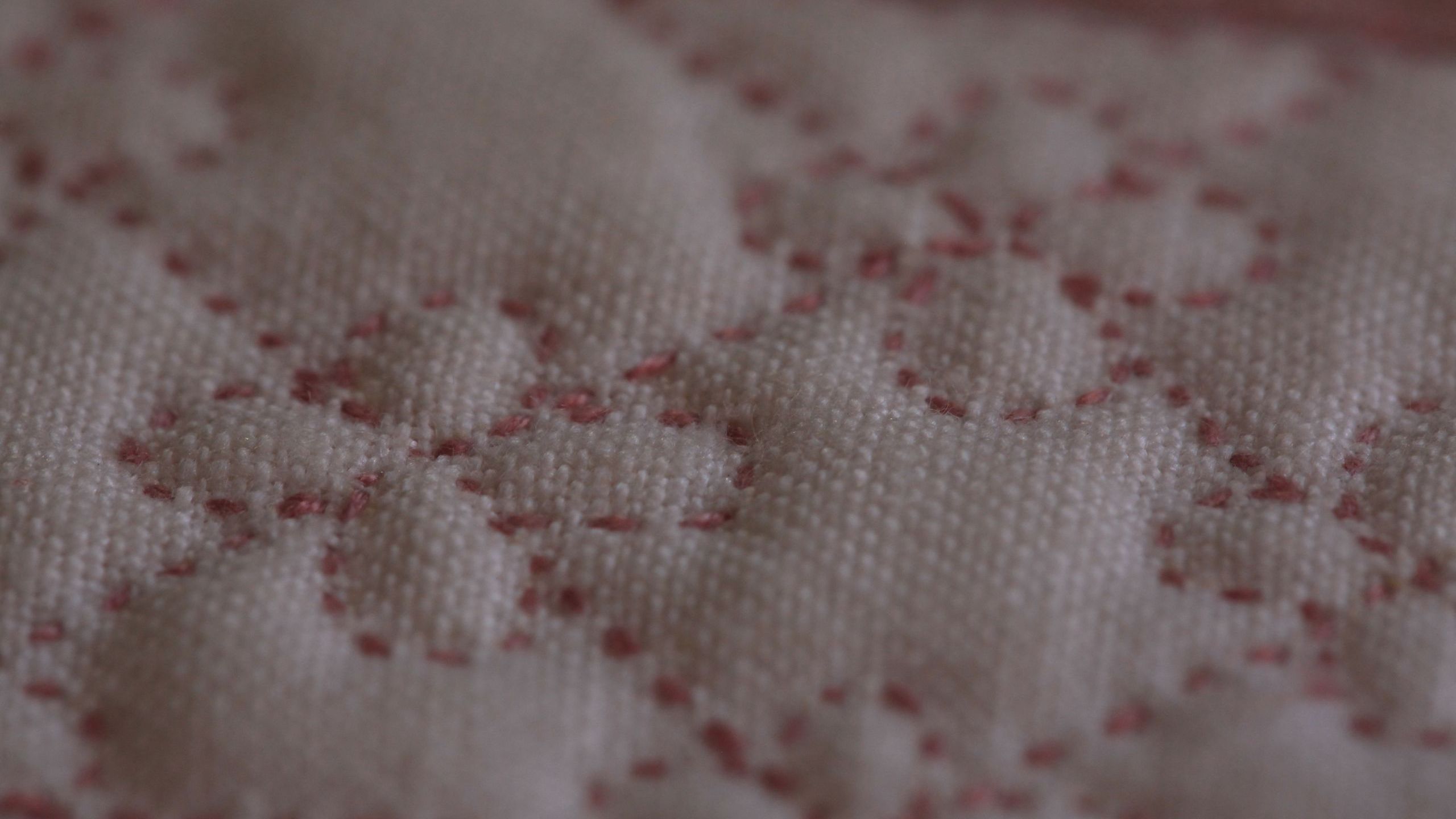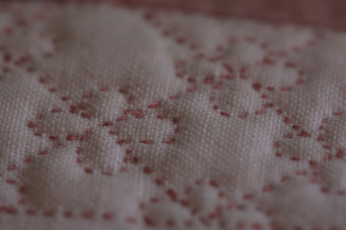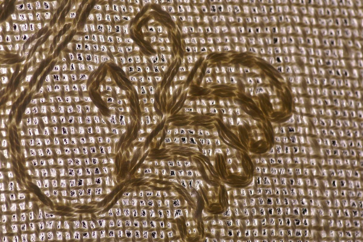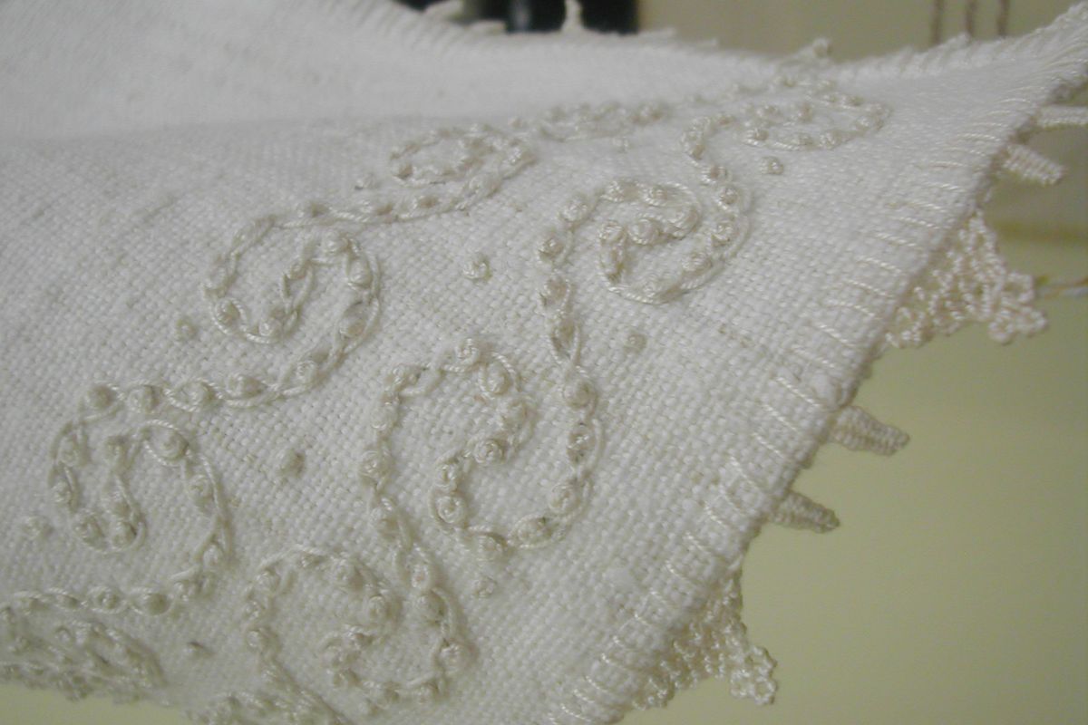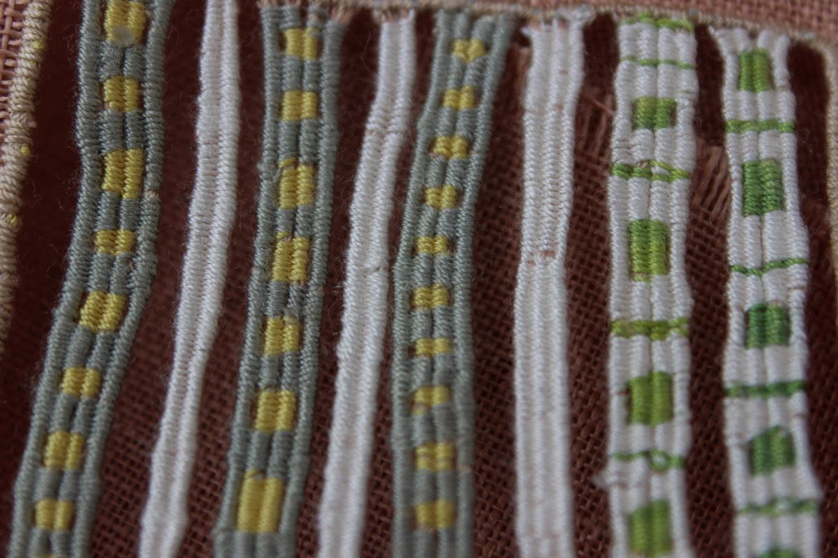 Ricamo a fili contati, le filze orizzontali e verticali creano una tessitura che infittisce quella di base