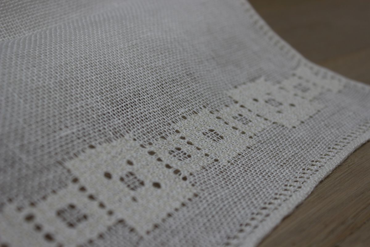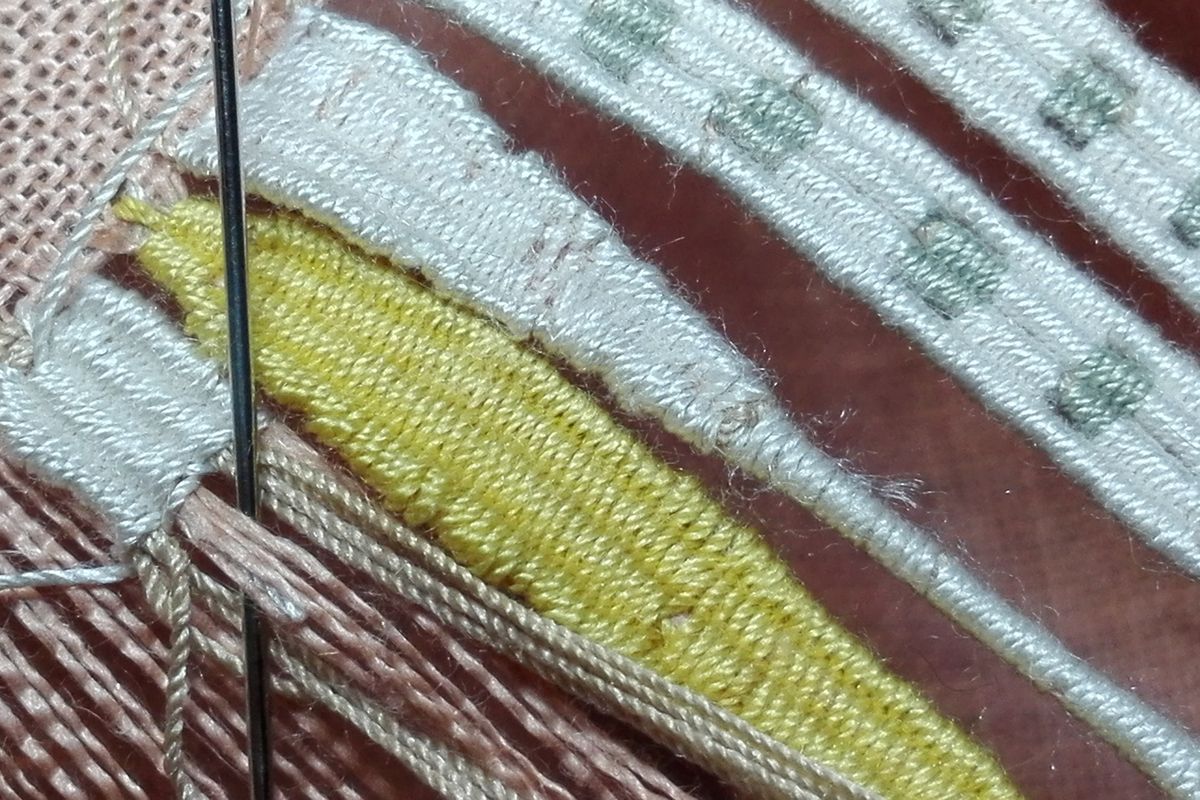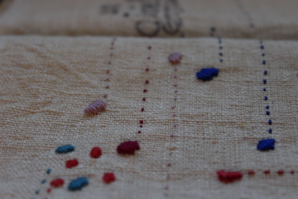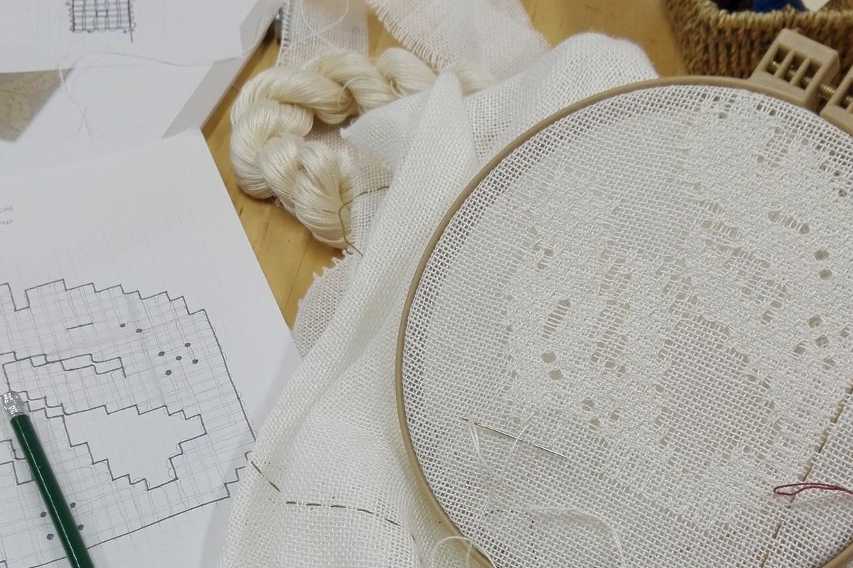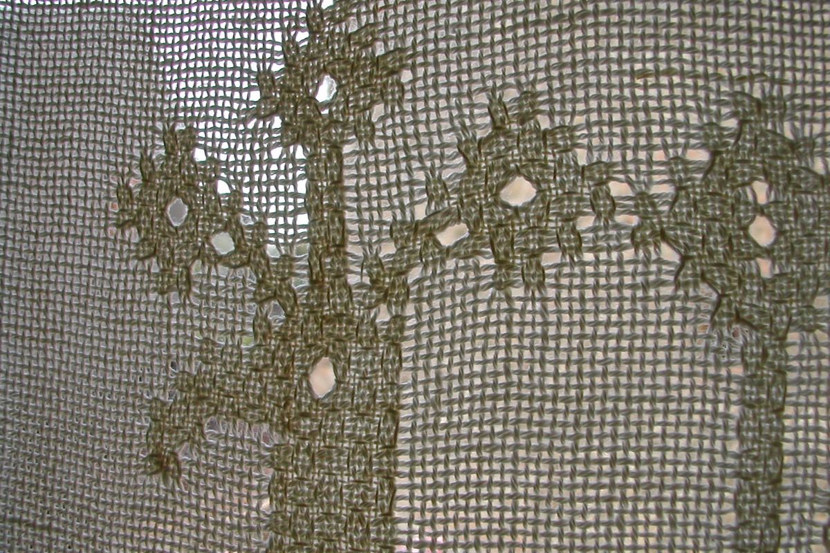 Counted thread embroidery, horizontal and vertical running stitches creating a warp thickening the original one
