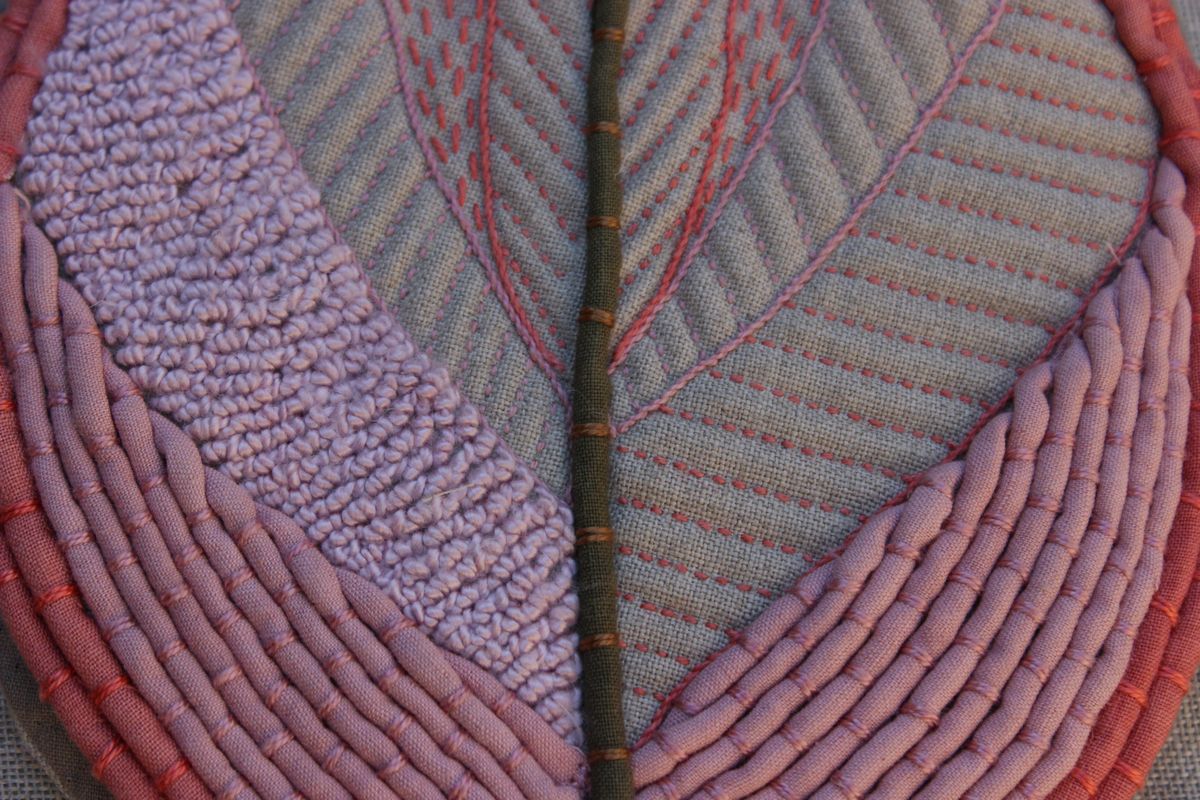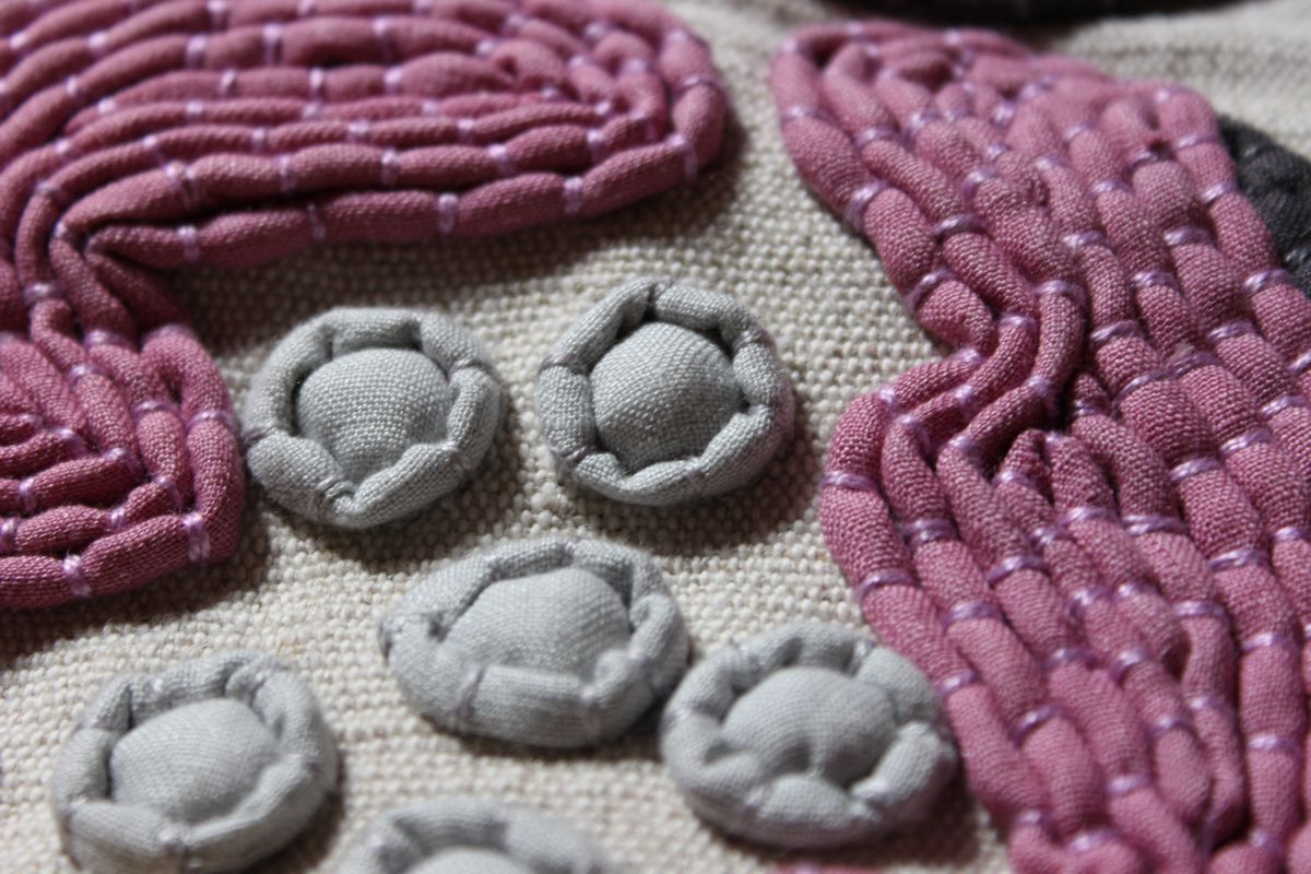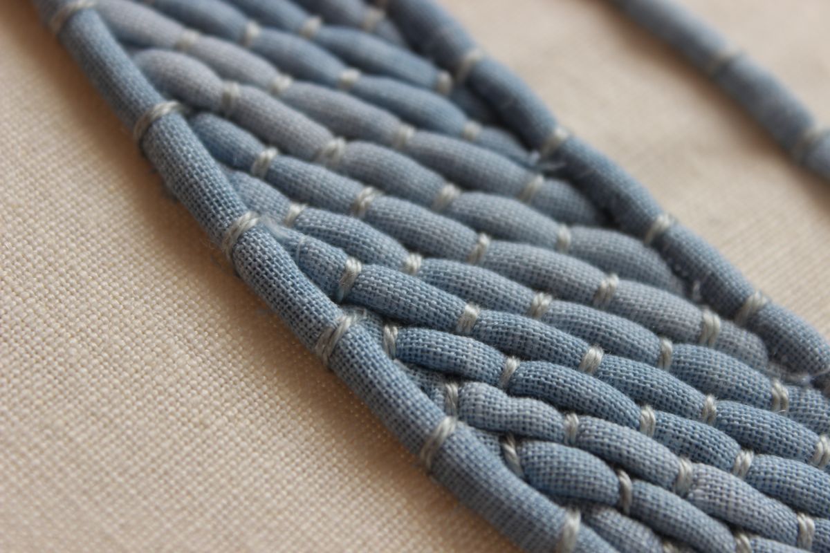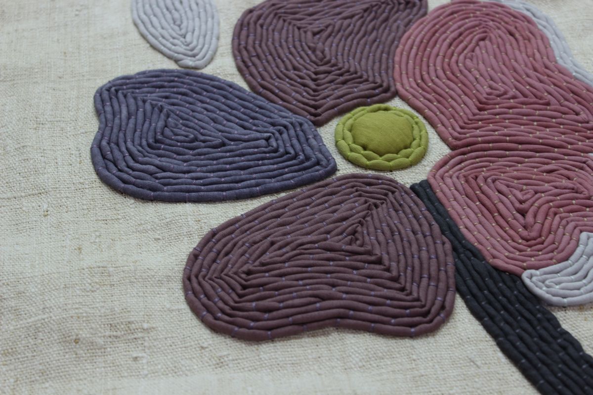 Free embroidery, little rolls of fabric are applied to the cloth using couching stitch