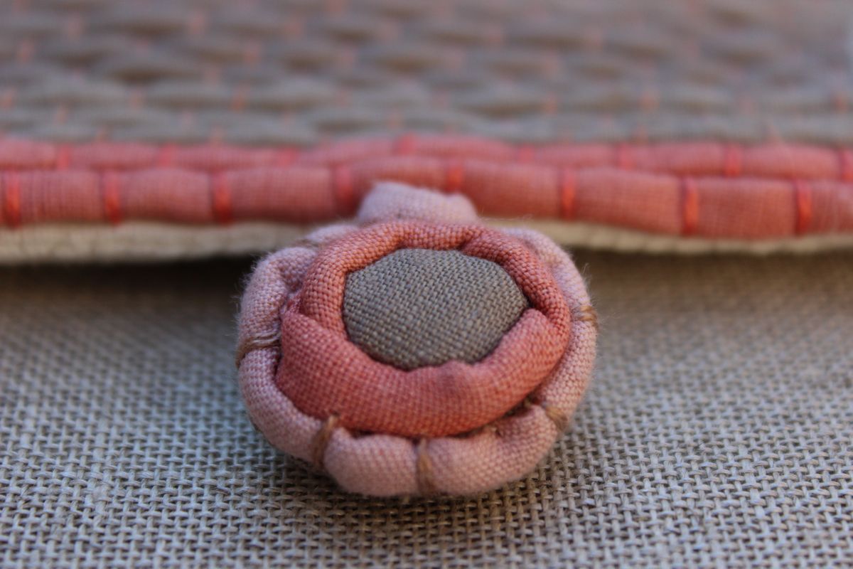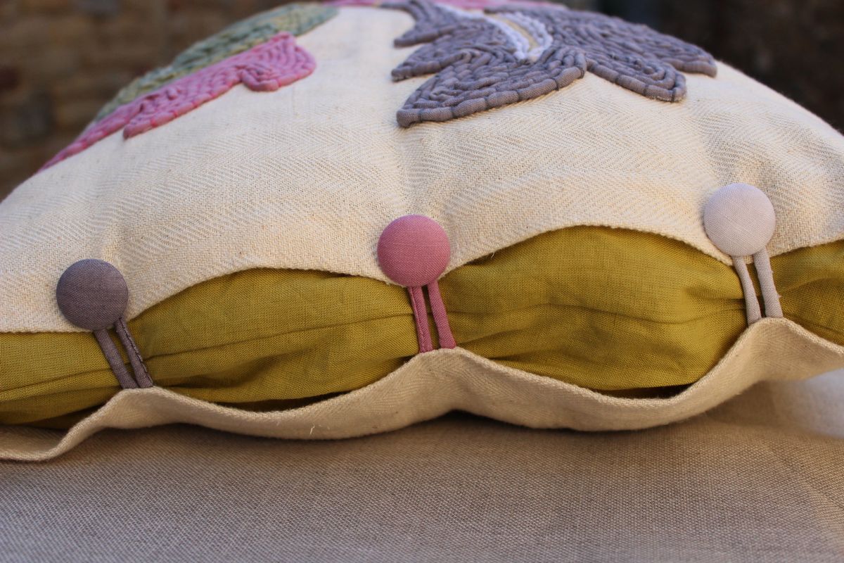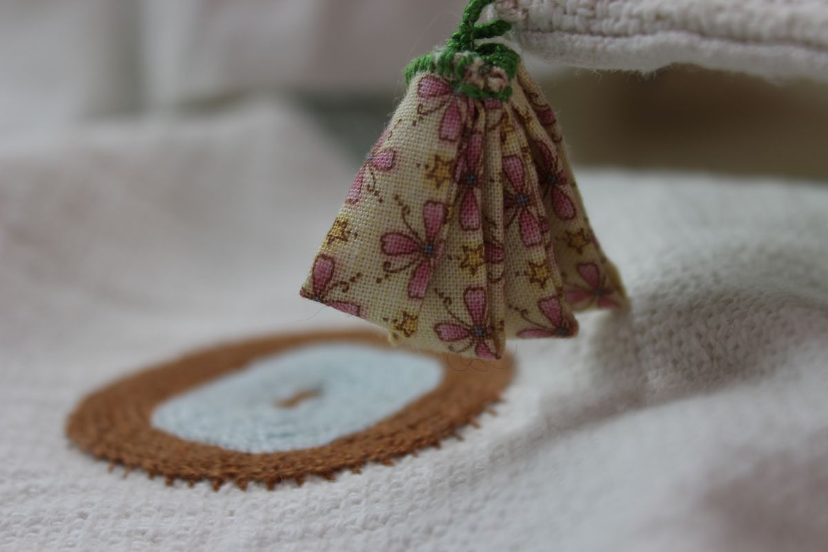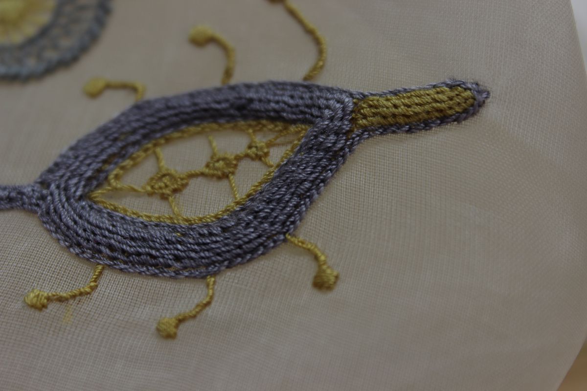 Free embroidery, little rolls of fabric are applied to the cloth using couching stitch
