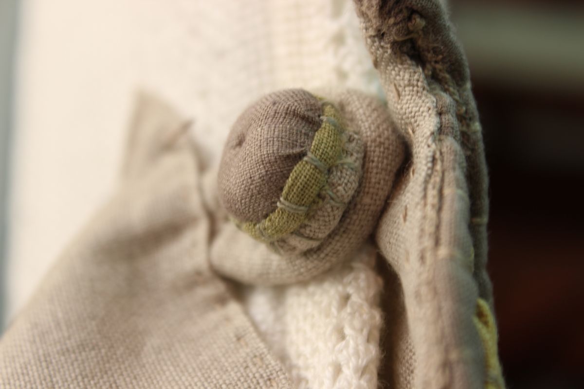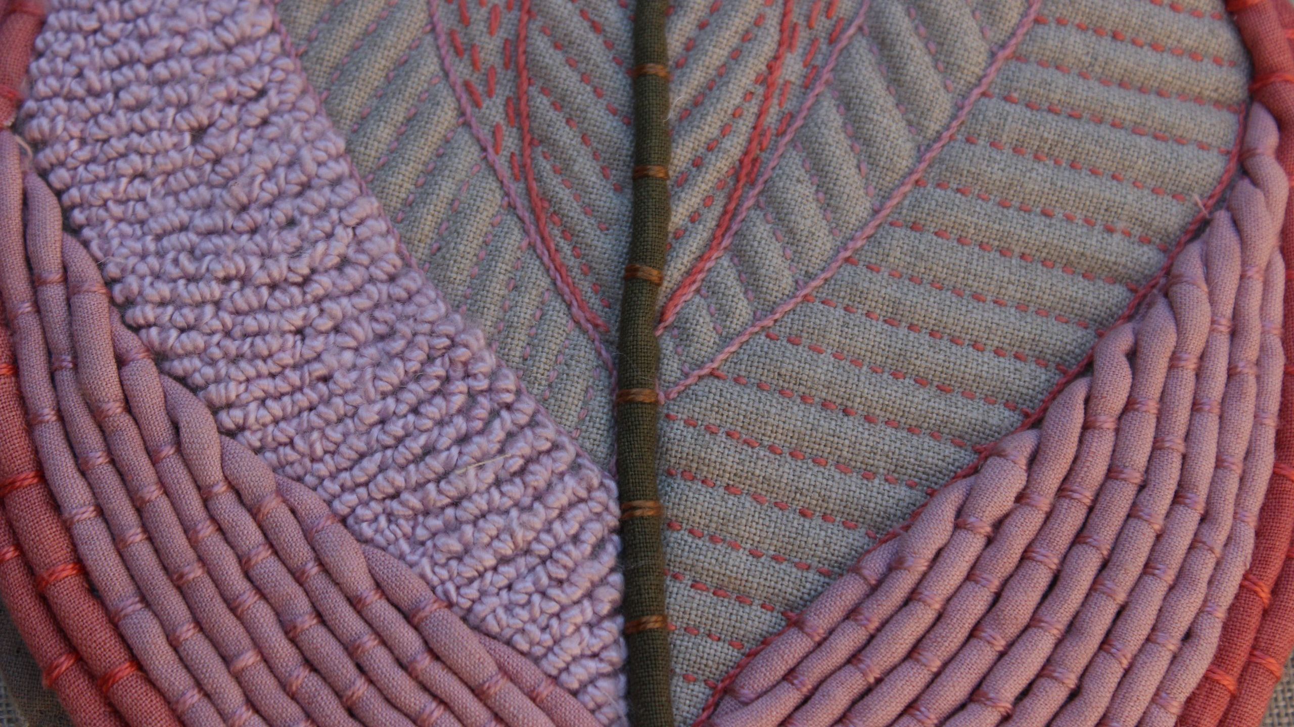 Ricamo libero, rotolini di tessuto vengono applicati sulla tela di fondo con punti posati