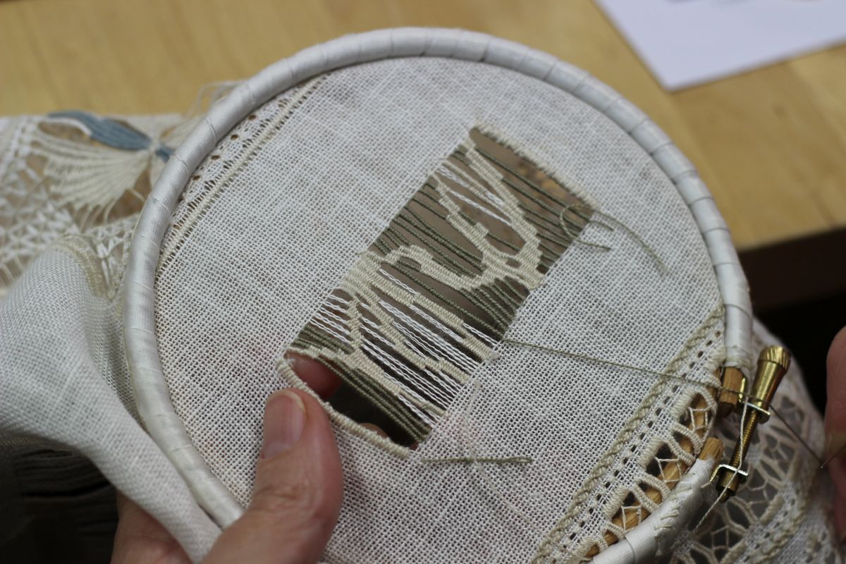 A jour work, withdrawn element work in one direction and embroidered to create a decorative effect
